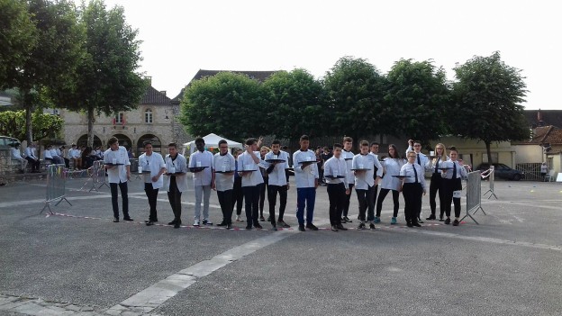 Vendredi 25 mai 2018, les élèves du lycée Hôtelier Quercy Périgord de Souillac (Classes de seconde et 1ere BAC PRO, secondes CAP et Boulanger pâtissier) ont participé à la première « course de garçons de café » organisée par Mmes Stella Couraudon et Marjorie Gasc respectivement professeurs de restaurant et d’EPS. Animation inédite pour la ville, les locaux et les touristes ont pu voir déambuler à travers le centre ville et le marché hebdomadaire les lycéens en tenue professionnelle munis de plateaux et de verres d’eau. De nombreux ateliers sur la place Betz, lieu incontournable de la ville avaient été organisés pour faire gagner des points bonus aux différentes équipes à travers des jeux pédagogiques et ludiques concernant les techniques et connaissances professionnelles de l’hôtellerie restauration. Les élèves ont été enchanté de pouvoir faire connaître leurs métiers, avoir les nombreux encouragements des spectateurs.
