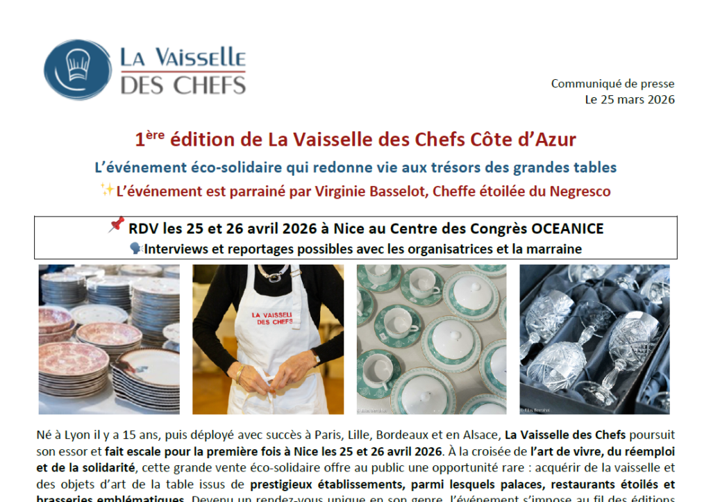 Le week-end des 25 et 26 avril, le Centre des Congrès OCÉANICE accueillera pour la première fois l’événement éco-solidaire qui redonne vie aux trésors des grandes tables : plus de 10 000 pièces de vaisselle, verrerie et argenterie issues de restaurants emblématiques et d’établissements étoilés de la Côte d’Azur.