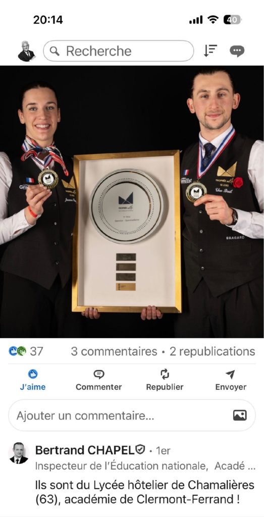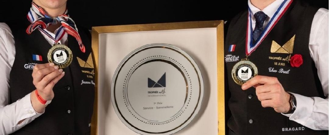 Félicitations à l’équipe française Jeanne CRUEGHE et Théo BREIL du @lyceechamalieresofficiel pour leur victoire au concours « Service-Sommellerie » lors de la 15ème édition du Trophée Mille International