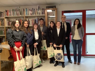 Carine Le Garff accompagnée des élèves et du documentaliste Franck Vilboux