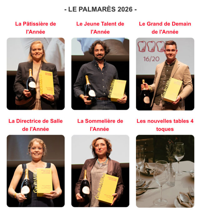 https://fr.gaultmillau.com/fr/news/gala-gault-millau-2025 Dans la catégorie Cuisinier de l’Année 2026 : César Troisgros du restaurant Le Bois sans feuilles - Maison Troisgros (4 toques) à Ouches.Dans la catégorie Pâtissier de l’Année 2026 : Anne Coruble du restaurant L’Oiseau Blanc - The Peninsula (3 toques d’or) à Paris.Dans la catégorie Sommelier de l’Année 2026 : Marion Cirino – du restaurant L’Ambroisie (5 toques d’or)...