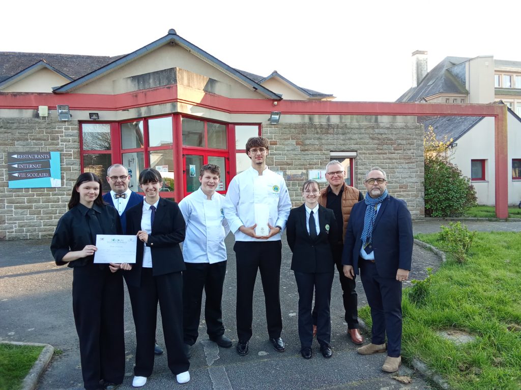Il s’agissait, pour la seconde compétition, du concours “Les Jeunes Talents de la Restauration” organisé par “Produit en Bretagne”. Le lieu retenu pour cette joute culinaire était le lycée Jean Guéhenno de Vannes. Trois élèves de terminale constituaient l’équipe du lycée bretillien : Emilie Magré en salle, Tom Benner et Kenaël Wisniewski-Mangin en cuisine. Pour la 5ème année consécutive, le lycée Notre-Dame décroche la première place. Ce concours avait pour objectif de valoriser les produits bretons, à travers la réalisation d’un dessert créatif à base de blé noir et de vanille de Bretagne, ainsi que d’un plat imposé particulièrement technique (pavé de lieu jaune en écailles de pommes de terre et langouille), le tout en trois heures. Les deux garçons s’en sont tirés admirablement bien. De son côté, Émilie devait dresser une table en utilisant des éléments végétaux et/ou minéraux, puis présenter les deux réalisations en argumentant un accord mets-vins ; elle réalise elle aussi une magnifique prestation. Ces trois jeun es ont fait preuve d’un engagement remarquable et ont su tirer pleinement profit des précieux conseils de leurs enseignants (Bertrand Hallier en cuisine, Mario Gapais et David Frabot en salle).