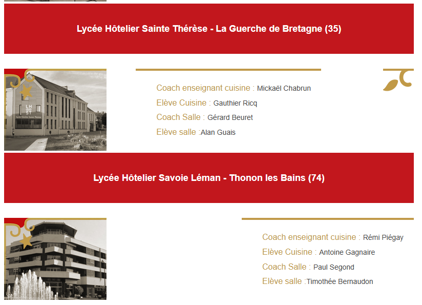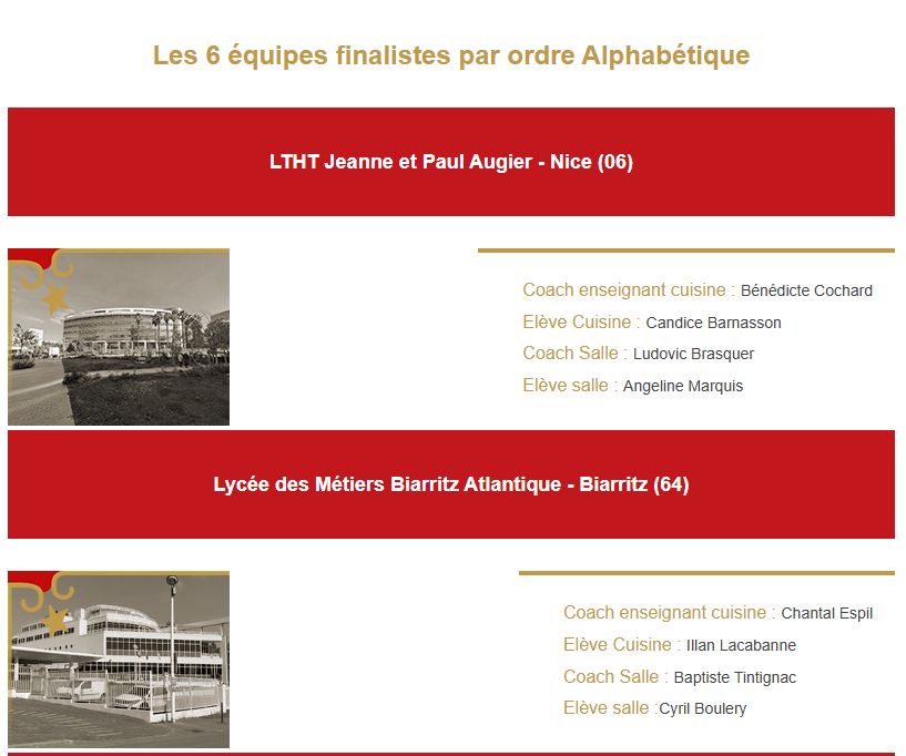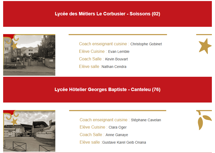 Après avoir été sélectionnés par le chef Alexandre Couillon, président du Concours Écoles et Simon Degraix, coach enseignant lauréat de l’édition 2025, voici la liste des finalistes qui s’opposeront à Laval le 26 mars prochain.‌   ­‌   ­‌   ­‌
