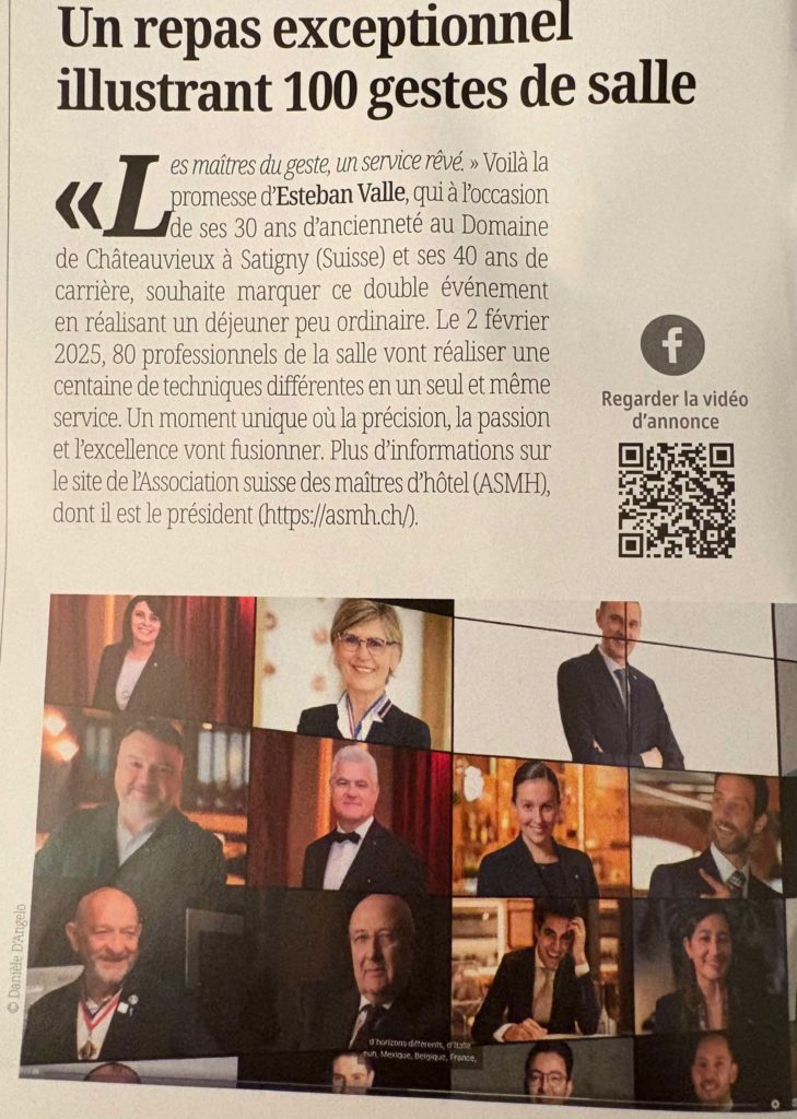 Une fois n’est pas coutume, la salle va réellement jouer les premiers rôles à l’occasion d’un repas très particulier placé sous la houlette d’Esteban Valle. « J’ai souhaité, en collaboration avec Philippe Chevrier et grâce à la participation de l’Association Suisse des Maîtres d’Hôtel dont je suis le président, marquer cet événement en réunissant mes confrères pour mettre en lumière et valoriser notre métier à travers l’art de la gestuelle » explique-t-il.